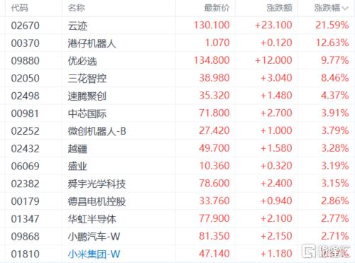 机器人概念股活跃,云迹涨超21%,优必选、三花智控、速腾聚创、中芯国际、微创机器人等跟涨。