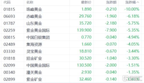 黄金股集体下跌,赤峰黄金跌超6%,山东黄金、紫金黄金国际、中国白银集团、集海资源、灵宝黄金、招金矿业等跟跌。