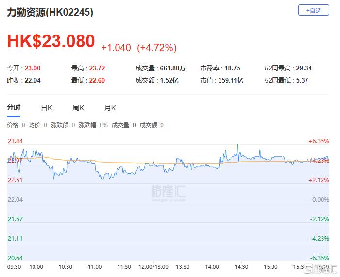 力勤资源上涨4.72%报23.08港元,总市值为359.11亿港元。