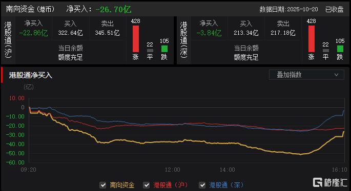 今日,南向资金净卖出26.7亿港元,其中港股通(沪)净卖出22.86亿港元,港股通(深)净卖出3.84亿港元。
