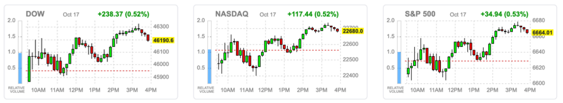 截至收盘,道琼斯指数上涨 238.37 点(+0.52%) 至 46,190.61 点;标普 500 指数上涨 34.94 点(+0.53%) 至 6,664.01 点;纳斯达克指数上涨 117.44 点(+0.52%) 至 22,679.97 点。VIX 恐慌指数暴跌近 18%,显示市场避险需求显著回落。
