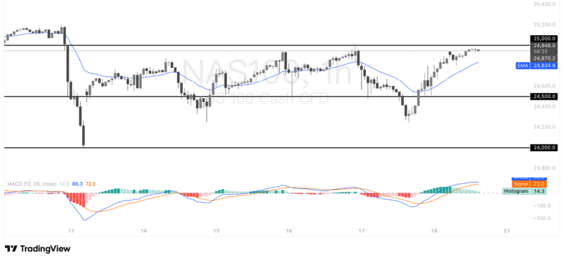 纳斯达克100指数(NAS100)在1小时图上维持区间震荡结构,价格目前逼近25,000上方压力位,短线多头动能放缓。MACD柱状图虽仍为正值,但动能增速趋缓,显示上行动能减弱。若价格未能有效突破25,000关口,短线或将回调测试24,870–24,500支撑区;反之,若放量突破25,000,将有望延续反弹趋势。