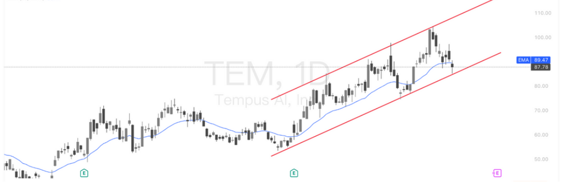 Tempus AI(TEM)日线走势仍运行于上升通道内,当前回测通道下沿及20日均线支撑区域(约87–89美元),短线进入关键支撑考验。MACD动能柱转负显示短期动能减弱,若能在通道下轨获得支撑企稳,有望延续中期多头趋势;反之,若跌破该区域,则或将打开进一步回调空间。