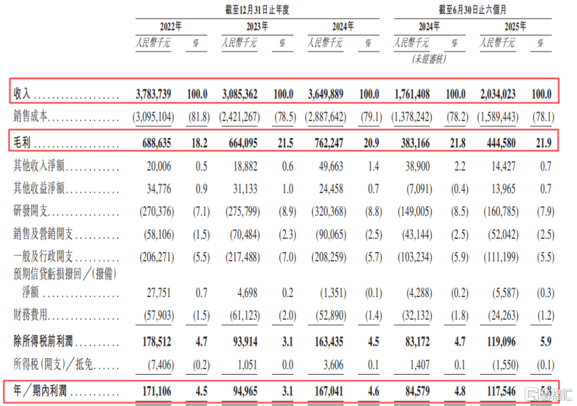 2022年、2023年、2024年和2025年1-6月(报告期),公司的总收入分别为37.84亿元、30.85亿元、36.5亿元、20.34亿元,净利润分别为1.71亿元、9500万元、1.67亿元、1.18亿元。