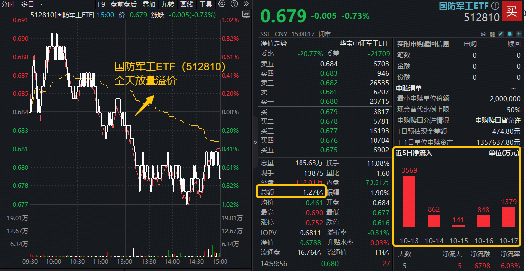 资金面有新动向的还有国防军工相关标的。截至10月17日,场内热门国防军工ETF(512810)连续6日吸金合计逾7300万元,今日行情震荡,场内放量溢价,或有低吸资金逢跌介入。