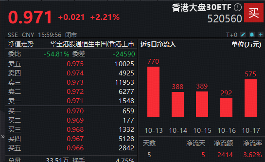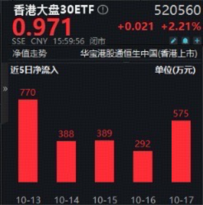 资金面,今日香港大盘30ETF(520560)高位震荡,盘中再度频现溢价交易。值得注意的是,自10月13日上市以来,香港大盘30ETF获资金高度关注,连续五日连连加仓,近一周稳定净流入超2400万元,成为十月新上市ETF中,唯一上市后连续5个交易日资金净流入的产品。