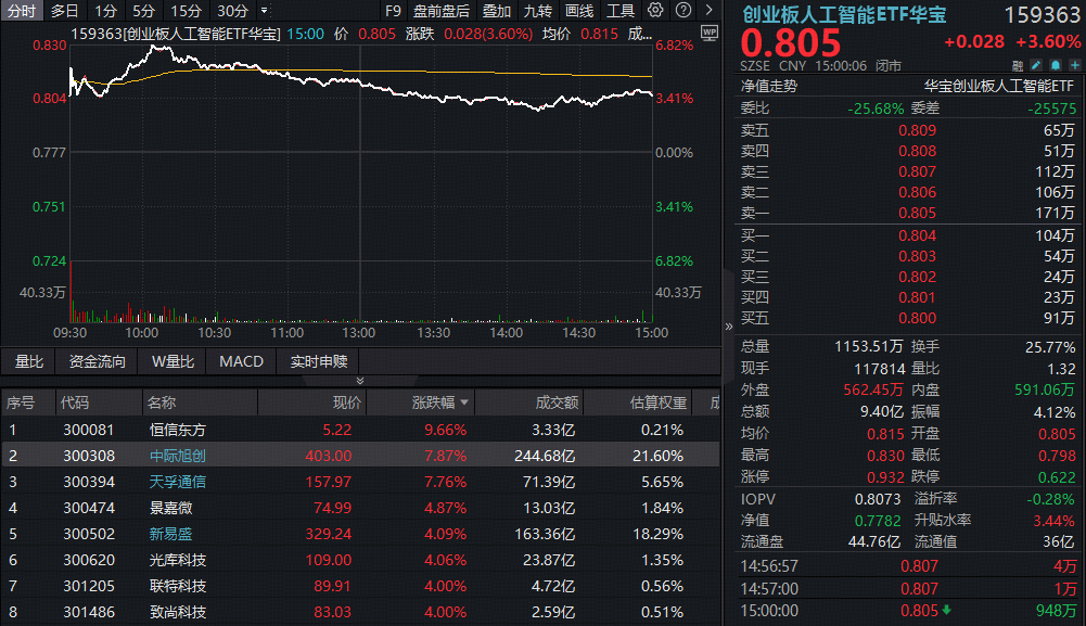 一、创业板人工智能高“光”回归!1.6T光模块需求上调,中际旭创涨近8%交投登顶,159363放量上攻3.6%