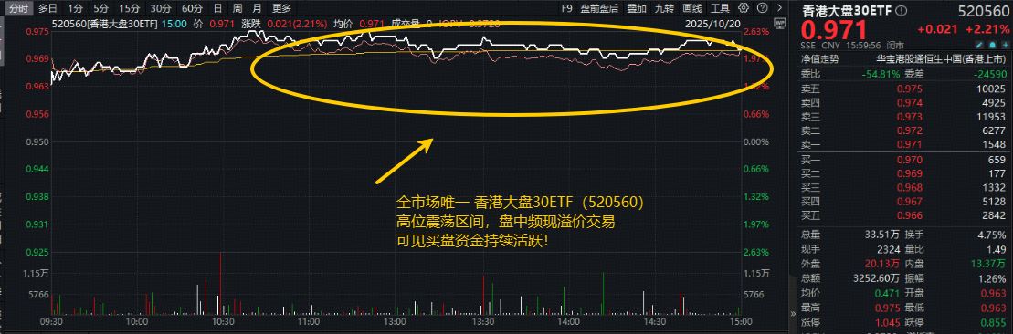 值得关注的是,香港大盘30ETF(520560)是全市场唯一跟踪恒生中国(香港上市)30指数的ETF,自带“科技+红利”哑铃策略,自10月13日上市以来日日吸金,今日场内再现高频溢价,反映买盘强势,多头积极介入。