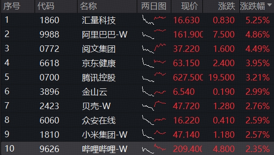 港股反弹日,截至收盘,恒指、恒科指分别上涨2.42%、3%,科网龙头集体走强,阿里巴巴-W涨近5%,腾讯控股涨超3%,小米集团-W、哔哩哔哩-W、美团-W均涨超2%。