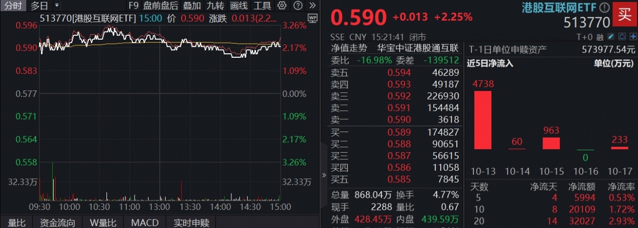 港股AI核心工具——港股互联网ETF(513770)早盘高开后维持高位震荡,场内价格一度涨逾3%,收涨2.25%,全天成交额超5亿元。