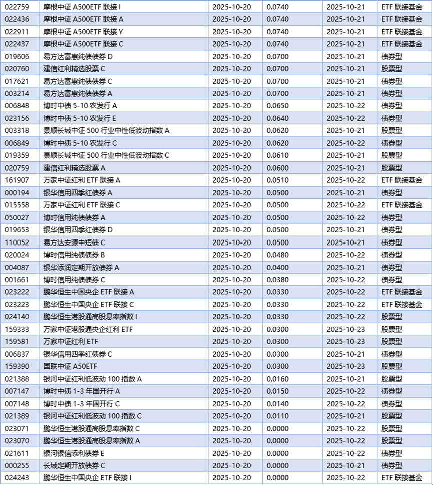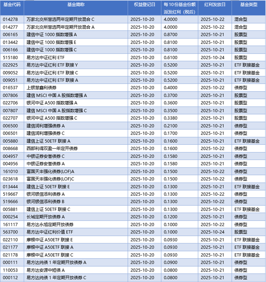 四、10月20日基金分红一览