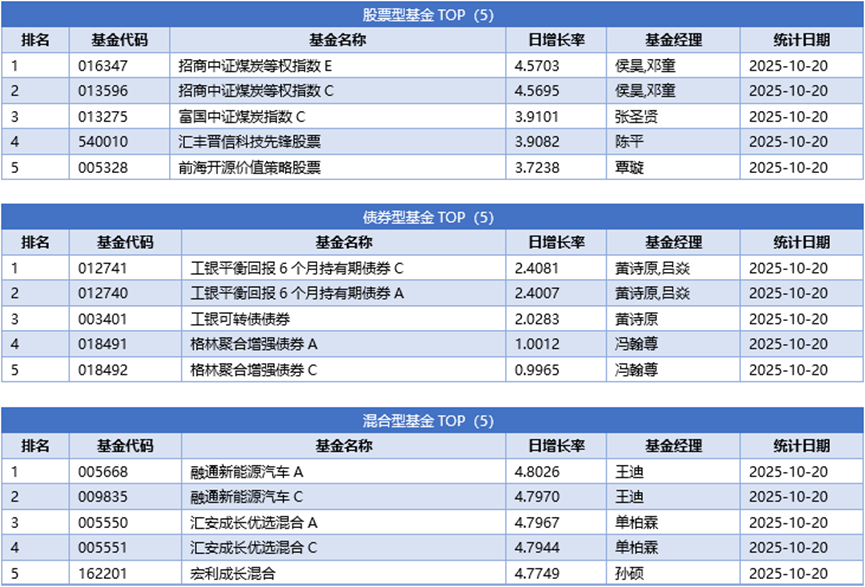 单基金方面,剔除掉 创新封基类型 基金的影响,10月20日业绩表现最好的基金为融通新能源汽车A,日增长率为4.8026%,其次为融通新能源汽车C,日增长率为4.7970%、汇安成长优选混合A,日增长率为4.7967%。