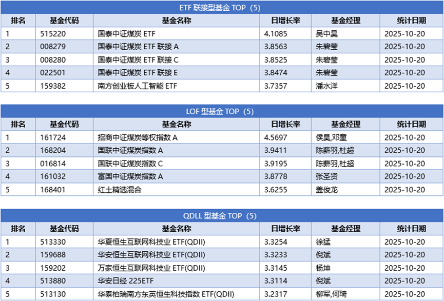 分投资类型看,同样剔除掉分级杠杆及固定收益两类基金的影响,股票型基金冠军为招商中证煤炭等权指数E,日增长率为4.5703%;债券型基金冠军为工银平衡回报6个月持有期债券C,日增长率为2.4081%;混合型基金冠军为融通新能源汽车A,日增长率为4.8026%;货币型基金冠军为红土创新优淳货币A,日增长率为0.0339%;ETF联接基金冠军为国泰中证煤炭ETF,日增长率为4.1085%;LOF型基金冠军为招商中证煤炭等权指数A,日增长率为4.5697%;QDII基金冠军为华夏恒生互联网科技业ETF(QDII),日增长率为3.3254%;下面是不同类型基金日增长率TOP5 (剔除掉分级基金的影响)