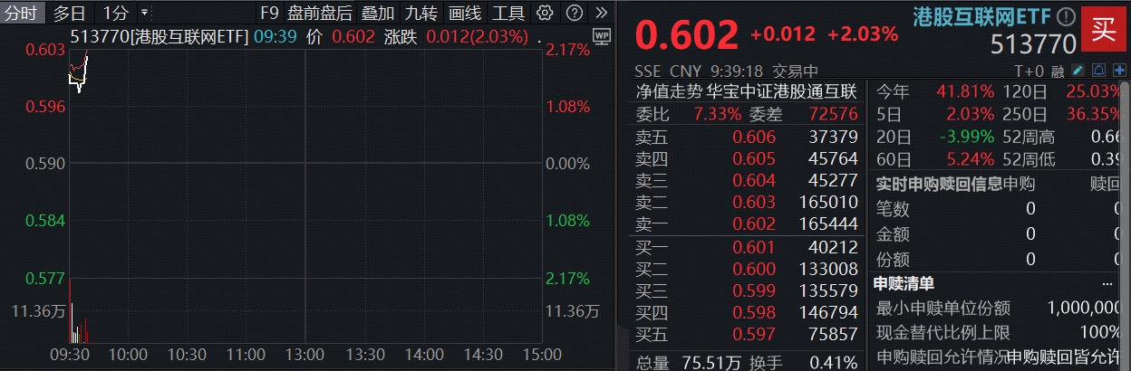 港股AI核心工具——港股互联网ETF(513770)高开向上,场内价格现涨2.03%,站上60日线。