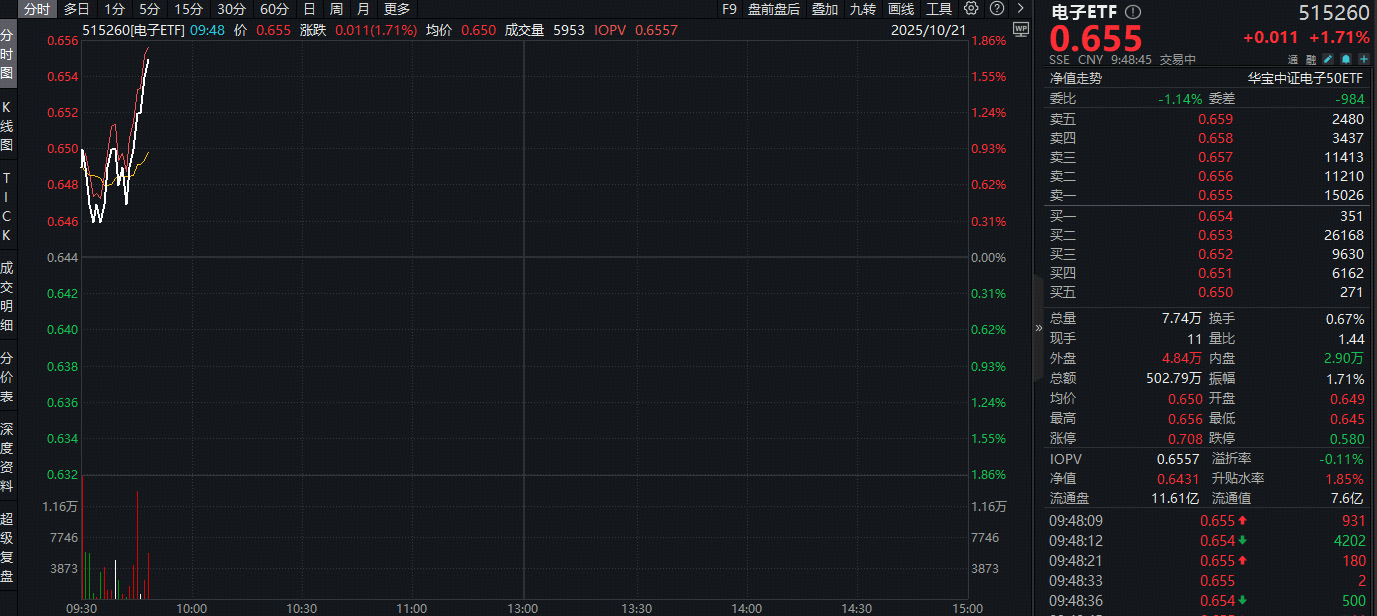 盘面上,今日(10月21日)苹果产业链个股强势崛起,果链含量43%的电子ETF(515260)强势上攻,场内价格现涨1.71%,盘中收复5日均线。