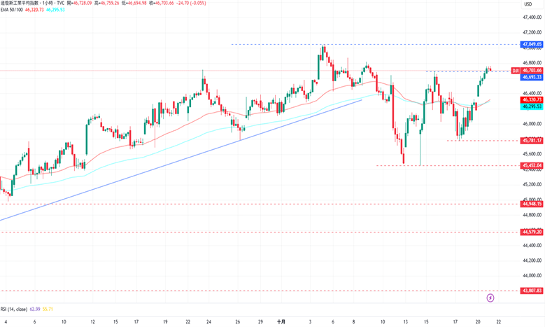 周一,道琼工业指数上涨至46705点。随着市场对美国信贷风险的担忧减轻,投资人将焦点转向企业财报季与美国政府关门的最新进展。政治方面,美国政府停摆已进入第20天。美国首席经济顾问哈塞特周一表示,政府关门「很可能在本周结束」;若未能如期解决,美国将考虑采取更强硬措施。贸易方面,美国总统近期对中国的态度再度转变,他警告若在11月1日前未能达成协议,美国可能对中国商品征收155%的关税。此前,美国与澳洲签署关键矿产合作协议,期望降低对中国稀土的依赖。展望后市,市场将关注Netflix、可口可乐、特斯拉、IBM与英特尔等大型企业的财报表现。