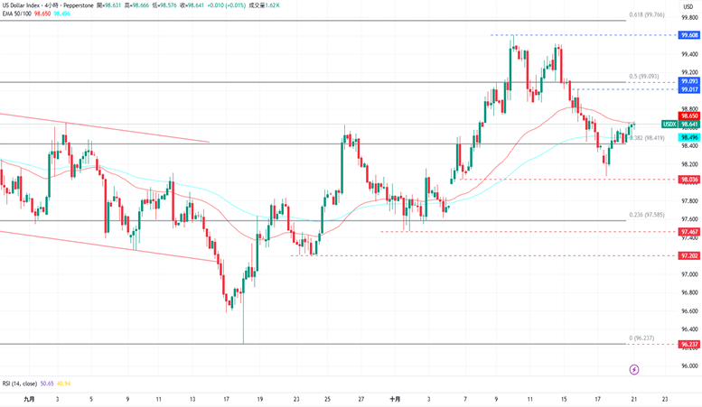 周一,衡量美元兑六种主要货币的美元指数上涨至98.641。由于当日缺乏重大经济数据,且美国政府持续停摆,市场焦点转向日本与欧洲的政治局势,美元走势整体震荡。美国政府停摆已进入第20天,白宫首席经济顾问哈塞特周一表示,政府关门「很可能在本周结束」;若未能如期解决,美国将考虑采取更强硬措施。展望后市,本周美国经济数据相对稀少,焦点仍集中于周五将公布的消费者物价指数(CPI)报告,该数据将为下周的联邦公开市场委员会(FOMC)会议提供关键政策依据。