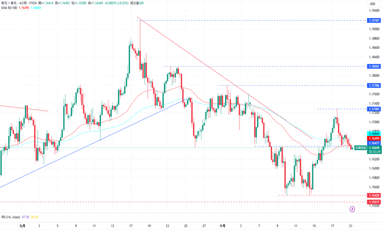 周一,欧元/美元下跌至1.16414美元。欧洲方面,欧洲央行官员陆续发表谈话。德国央行行长内格尔表示,目前可对利率政策保持观望态度;欧洲央行执委施纳贝尔则指出,欧元在全球金融体系中的地位依然强劲,应进一步加强。经济数据方面,德国9月PPI月率录得-0.1%,低于市场预期的0%,前值自-0.5%下修至-0.8%。美国方面,政府停摆进入第20天,市场普遍等待周五将公布的消费者物价指数(CPI)报告,以寻找通膨与利率政策走向的线索。展望后市,本周美国经济数据相对稀少,焦点仍集中在周五的CPI数据,而欧元区方面,周二欧洲央行管委艾斯克里瓦及德国央行行长内格尔将先后发表谈话。
