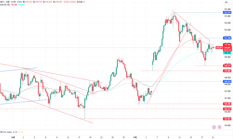 美元/日元保持在151.398水平下方盘整,受EMA50的负面压力以及下跌趋势线尚未被突破,目前前景仍保持看跌。上涨方面,美元/日元目前的阻力是10月16日的高点151.398,再来是10月14日的高点152.613。下跌方面,美元/日元初步的支撑为10月20日低点150.272,再来是10月17日低点149.371。