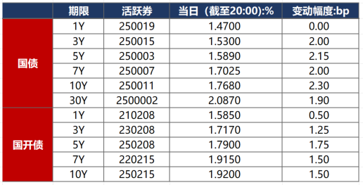 10月20日,股市反弹叠加中美会谈出现进展,带动市场风险偏好回暖,债市因此整体走弱。截至北京时间20:00,10年期国债活跃券250011收益率上行2.30bp至1.7680%,10年期国开债活跃券250215收益率上行1.50bp至1.9200%。