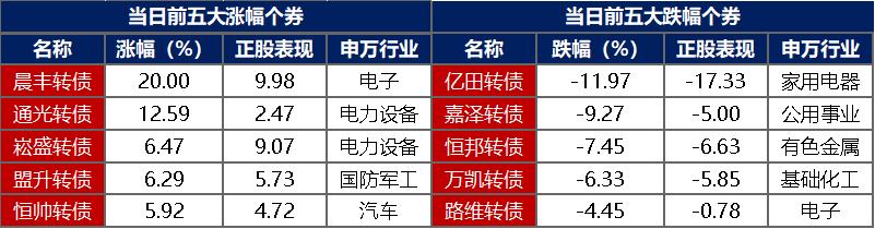 【转债市场主要指数涨跌不一】 10月20日,转债市场跟随权益市场震荡分化,当日中证转债、上证转债分别收涨0.06%、0.17%,深证转债收跌0.09%。当日,转债市场成交额615.27亿元,较前一交易日放量12.07亿元。转债市场个券多数上涨,415支转债中,279支收涨,123支下跌,13支持平。当日上涨个券中,晨丰转债涨停20%,通光转债涨超12%;下跌个券中,亿田转债跌逾11%,嘉泽转债跌逾9%。