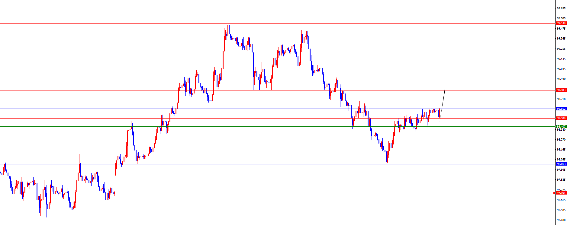 从多周期分析,周线价格经过前期持续震荡后于上周进行站稳,上周价格进行回踩周线支撑位置下跌,目前周线支撑于98区域,后续关注进一步中期多头(需要注意缺口位置)。从日线级别看,随着时间的推移目前日线阻力于98.60区域,此位置是波段走势的关键,近期价格在此位置上下盘整,短线操作需要结合小周期。从四小时上看,在近期波动过程中我们发现价格依托四小时关键位置运行,针对昨日价格突破四小时阻力,则此位置变成关键支撑,位置上暂时关注98.40-50区间,后续依托此区域进一步看上涨。一小时上看目前价格同样偏多,所以暂时先关注多头运行,上方暂时关注98.80区域阻力。