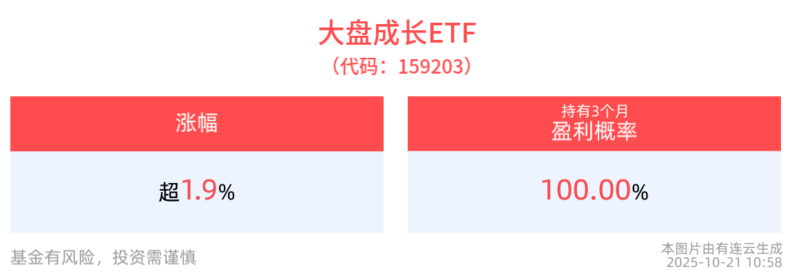 截至2025年10月21日 10:58,国证大盘成长指数强势上涨1.89%,成分股中际旭创上涨8.22%,立讯精密上涨6.72%,新易盛上涨6.16%,特变电工,中国船舶等个股跟涨。大盘成长ETF(159203)上涨1.94%,最新价报1.31元。拉长时间看,截至2025年10月20日,大盘成长ETF近3月累计上涨22.32%。