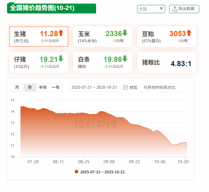 目前行业的情况是——猪价低、养殖亏损。最新全国生猪均价为11.28元/公斤,虽然相比前几天小幅反弹,但也已经跌穿成本线,这意味着养得越多,亏得越狠。