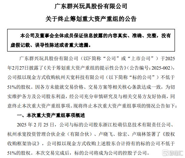 群兴玩具表示,终止本次重大资产重组不会对公司现有生产经营活动、财务状况和战略发展造成重大不利影响,不存在损害公司及全体股东尤其是中小股东利益的情形。