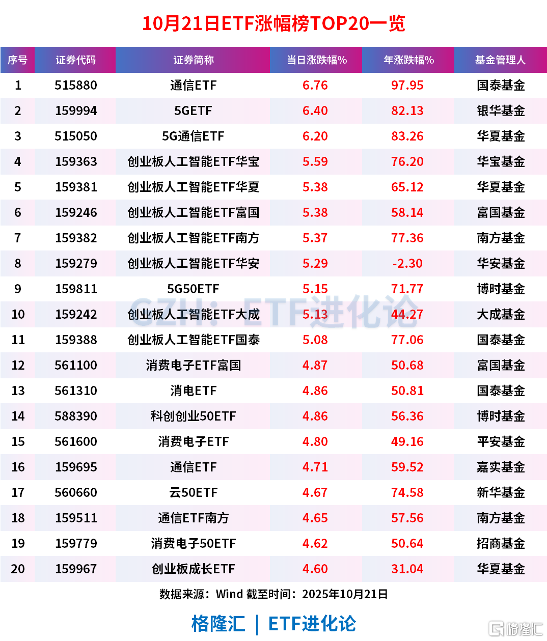 “AI算力含量高”的ETF霸屏涨幅榜,通信ETF、5GETF和5G通信ETF涨超6%。