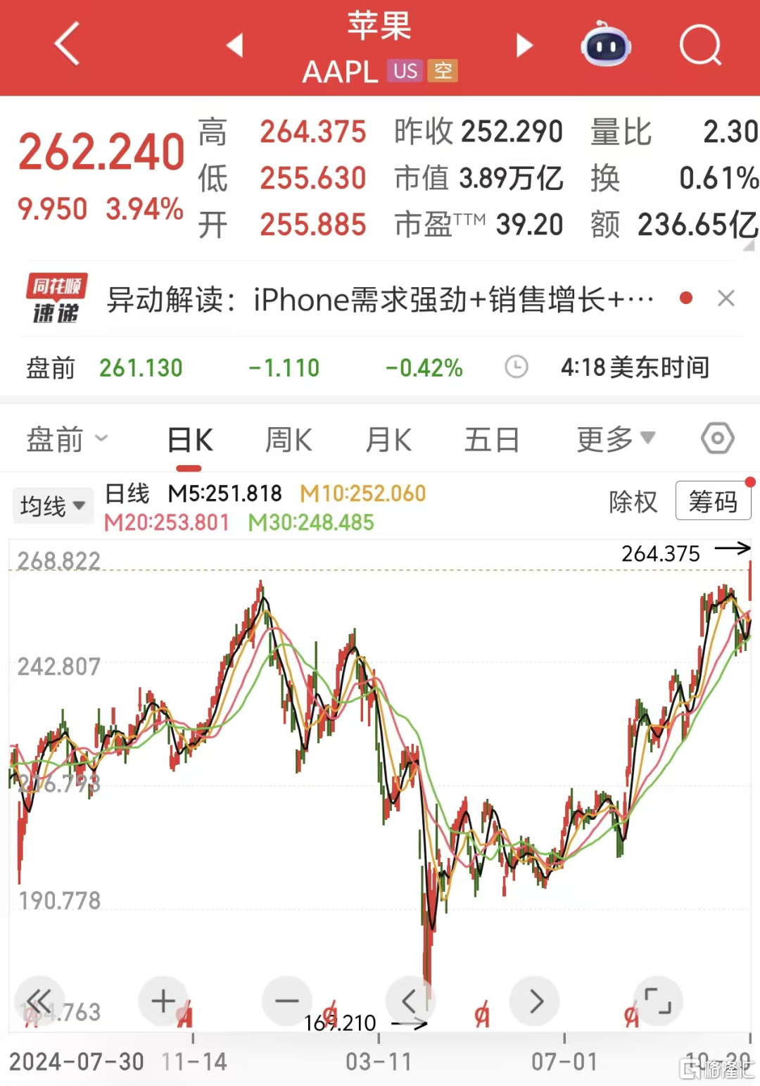 隔夜,苹果涨逾3.9%至262.24美元,市值达到约3.9万亿美元,今年首创新高,突破自去年12月高点,超越微软成为美国市值第二大的企业,仅次于英伟达。