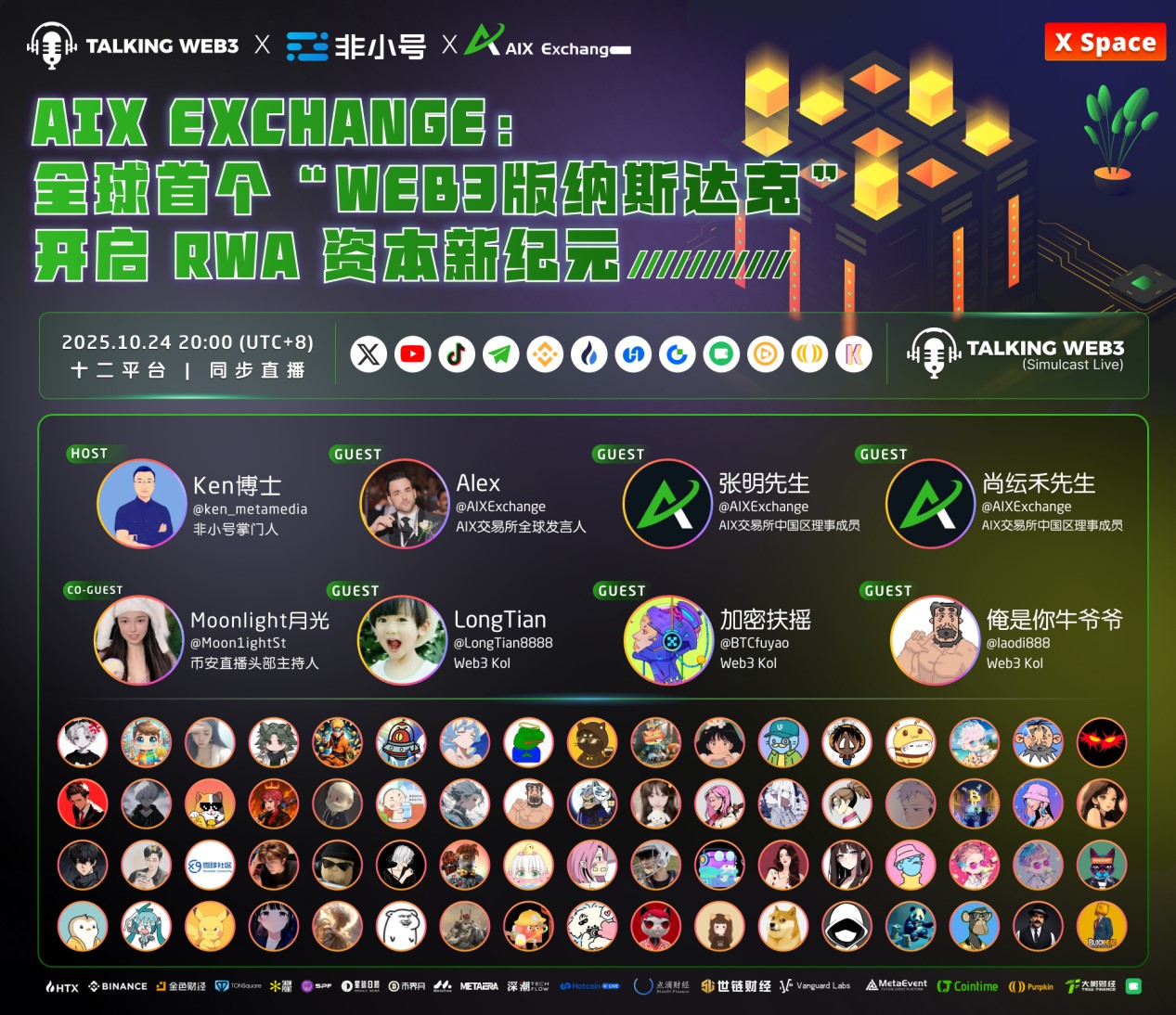 2025年10月24日20:00(UTC+8),全球领先的区块链媒体品牌非小号(Feixiaohao)、Talking Web3将携手新一代合规资本市场平台AIX Exchange,联合超百位华语知名KOL举办“华语区线上首秀”特别直播。