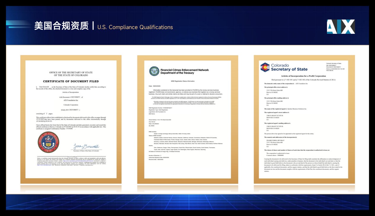 AIX 已获得美国SEC、FinCEN MSB 与欧盟MiCA 多重合规认证,并与多国政府合作,协助企业合法纳税与登记备案。这意味着,AIX 不仅合法合规,更是当前市场上为数不多真正具备跨区域监管资质的 Web3 金融基础设施。