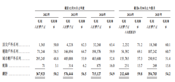 其中,城市轻户外系列在2022年至2024年分别实现收入6.06亿元、7.51亿元和9.15亿元,占总收入的比例分别为82.7%、73.6%、70.3%。2025年上半年实现收入4.49亿元,占比68.2%,尽管占比逐年下降,但仍是核心收入来源。顶尖户外与运动户外系列的收入占比从2022年的17%提升至2025年上半年的31.4%,逐渐成为拉动整体盈利水平的重要力量。