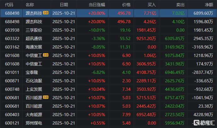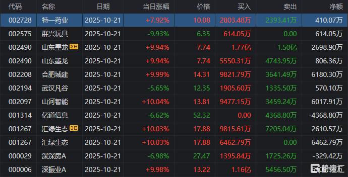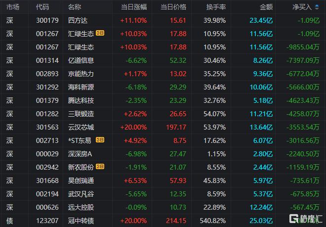 龙虎榜单日净卖出额前三为四方达、汇绿生态、亿道信息,分别为1.09亿元、9855.04万元、7397.09万元。