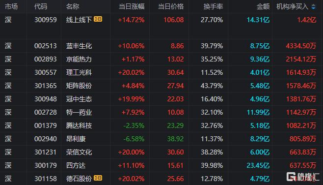 龙虎榜中涉及机构专用席位的个股中,当日净买入额前三为蓝丰生化、京能热力、理工光科,分别为4334.5万元、2154.12万元、1614.93万元。