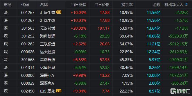 龙虎榜中涉及机构专用席位的个股中,当日净卖出额前三为汇绿生态、云汉芯城、海科新源,分别为1.57亿元、1.12亿元、5529.93万元。