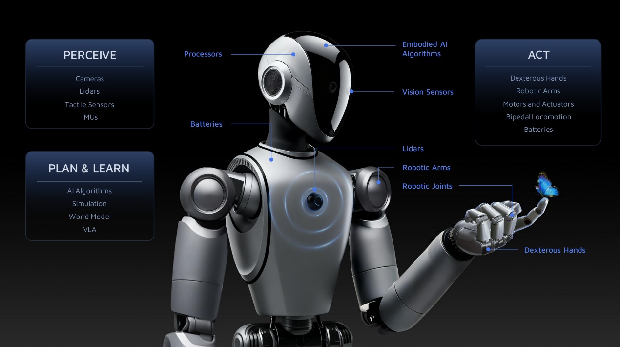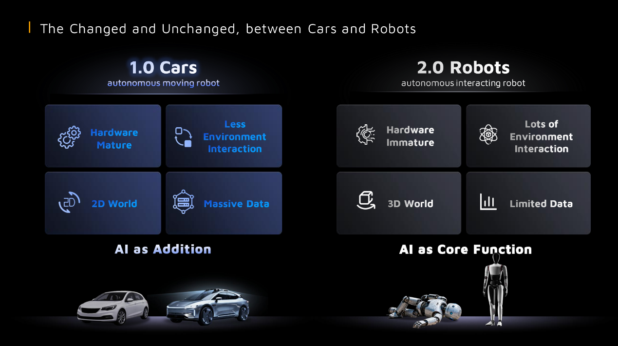 而谈及机器人行业,李一帆认为其与汽车行业的根本差异是汽车是 1.0的机器人,其核心是安全,而具身智能机器人是物理 AI 2.0,其核心是交互。相对于汽车而言,具身智能机器人是原生AI产品,硬件成熟度低、与环境交互强、缺乏海量数据,且软硬件难以解耦。