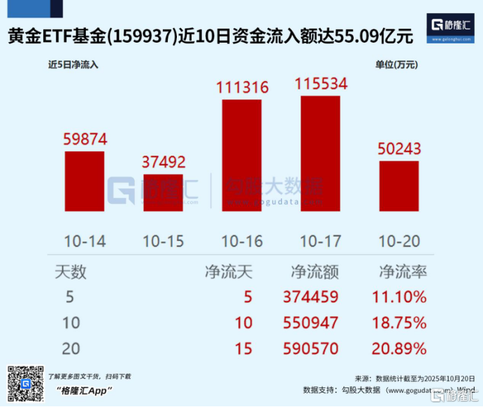 10月21日,黄金ETF基金(159937)再度收涨2.35%,重回放量上涨态势。而该ETF年内涨幅已经超过59%,表现远强于大多数其他热门赛道板块。