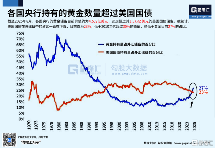 数据显示,自2022年俄乌战争以来,全球央行开启“囤金潮”,截至2025年8月,各国央行的黄金储备目前价值约为4.5万亿美元,已经远远超过其3.5万亿美元的美国国债储备。据统计美国国债在总储备中的占比一直在下降,目前仅为23%,低于2010年代超过30%的峰值,也低于黄金目前27%的占比。