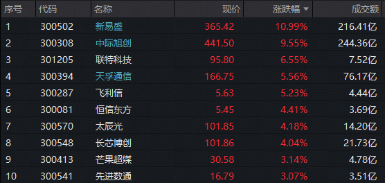 光模块CPO继续爆发,光模块含量超51%的创业板人工智能再度领涨市场,成份股大面积收红。其中,中际旭创再涨超9%斩获五连涨,股价累涨超27%直逼历史高点,新易盛收涨近11%,联特科技、天孚通信、太辰光、长芯博创等多股大涨超4%。