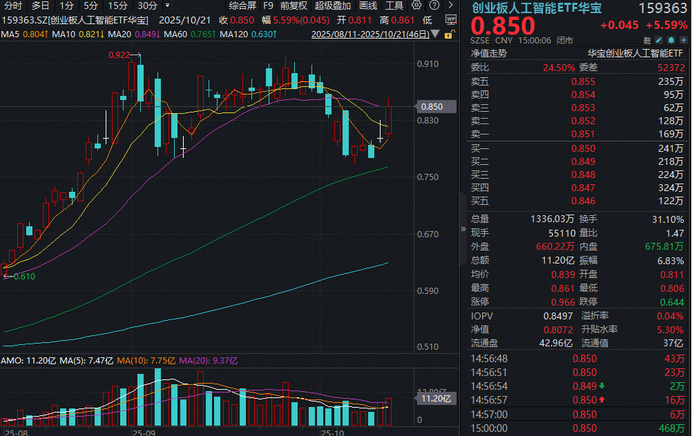 热门ETF方面,同类规模最大、流动性突出的创业板人工智能ETF(159363)场内再涨5.59%,收盘站稳20日均线,另外5日均线也掉头向上,或孕育向上势头。单日涨幅高居全市场ETF涨幅第四,全天放量成交超11亿元。