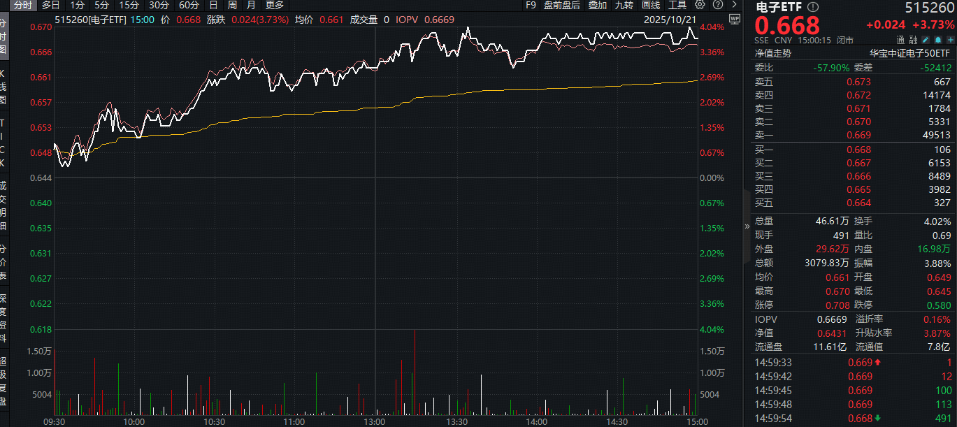 超240亿主力资金爆买电子板块,板块吸金额高居31个申万一级行业首位!热门ETF方面,覆盖半导体+苹果产业链的电子ETF(515260)场内涨幅最高上探4.04%,收涨3.73%,一举收复5日均线。