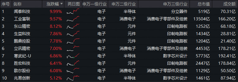 细分方向来看,芯片产业链持续走高,此前遭受荷兰不公正对待的闻泰科技午后涨停,三季报业绩亮眼的寒武纪涨超6%;苹果产业链强势上攻,工业富联涨超9%,立讯精密涨逾7%,歌尔股份涨逾6%;PCB(印制电路板)亦有亮眼表现,东山精密涨超8%,生益科技、鹏鼎控股涨逾7%。