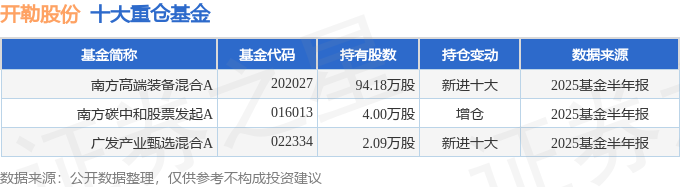 持有开勒股份最多的基金为南方高端装备混合A,目前规模为5.73亿元,最新净值3.4025(10月21日),较上一交易日上涨3.55%,近一年上涨53.54%。该基金现任基金经理为张磊。