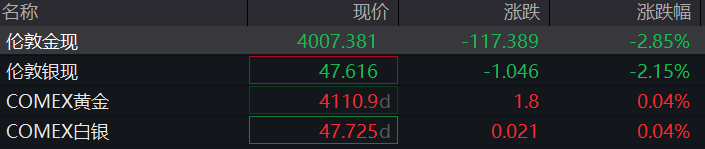 值得注意的是,大宗商品市场出现剧烈波动,现货黄金价格暴跌5.31%,报4124.355美元/盎司,盘中一度跌破4100美元/盎司,创下自2013年以来最大单日跌幅;现货白银下跌7.11%,COMEX黄金期货下跌5.07%。独立金属交易商Tai Wong分析称,过去一周黄金波动性上升显示市场谨慎情绪增多,部分投资者短期获利了结。Kitco Metals高级分析师Jim Wyckoff指出,本周初金融市场的整体风险偏好增强,对黄金构成明显利空。