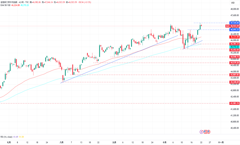 道琼指数再创下47125点的历史新高后回落,以消化RSI指针的超买讯号。上涨方面,道琼指数目前的阻力为10月21日的高点47125点。下跌方面,道琼指数目前的支撑为10月21日低点4688点,接着为EMA50均线所在的46224点。