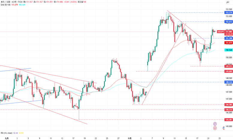 美元/日元突破了151.398的阻力水平,形成了看涨旗型的上涨型态,使该货币兑前景转向看涨。上涨方面,美元/日元目前的阻力是10月14日的高点152.613,再来是10月10日的高点153.274。下跌方面,美元/日元初步的支撑为10月20日低点150.272,再来是10月17日低点149.371。