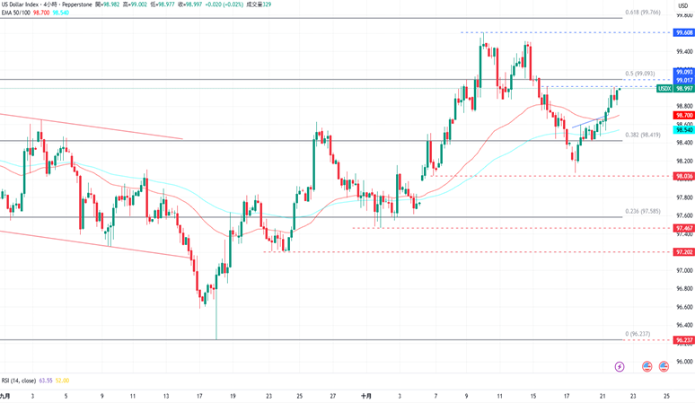CPT Markets分析师指出,在突破EMA50均线后,美元指数开始测试99.00的阻力水平,若成功突破,将向下一个目标99.608前进。上涨方面,美元指数目前的阻力为10月15日的高点99.017,再来是10月9日的高点99.608。下跌方面,美元指数目前的支撑为EMA50所在的98.710,接着是10月17日的低点98.069。