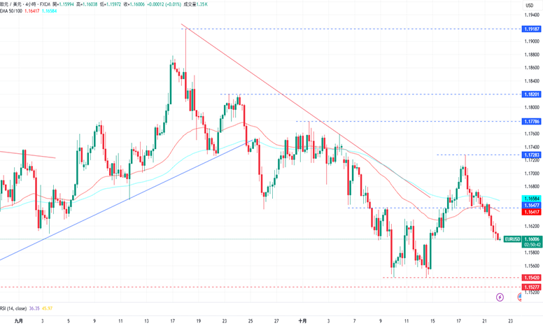 周二,由于近期美元走强,欧元区数据持续疲软,欧元/美元延续跌势,下跌至1.15995美元。中美贸易谈判出现进展迹象后,市场风险情绪改善,美元需求上升。美国总统周一指出,美中有望达成「公平的贸易协议」,同时,美国首席经济顾问哈塞特曾表示,政府关门「很可能在本周结束」。欧洲方面,欧洲央行首席经济学家连恩表示,在美元资金紧缩的情况下,欧元区银行可能面临流动性压力,进而限制对实体经济的贷款能力。周三美国经济数据仍然稀少,市场将关注周五的CPI数据及10月标普全球PMI报告;欧元区方面,欧洲央行行长拉加德预计将于周三发表谈话。